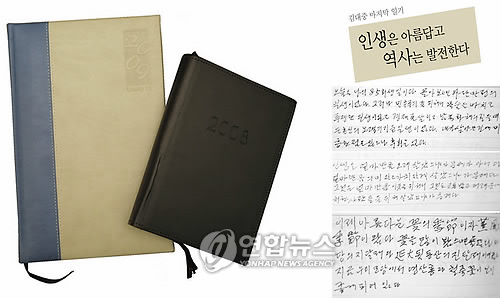 這本小冊子長達40頁的小冊子中,含有金大中在人生晚年對生活的感悟和作為前總統(tǒng)對時局的認識。在日記里,金大中似乎預(yù)見到自己已沒有多少時日,回顧自己波瀾壯闊的人生歷程,寫下了留給后世的“箴言”。他還提到健康問題和對一生伴侶李姬鎬女士的真摯的感情。