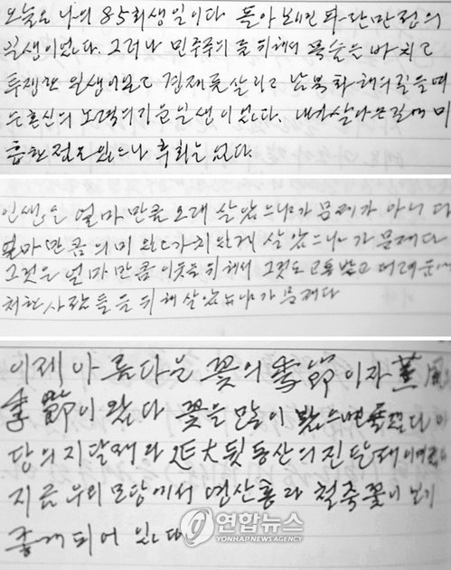 但他還進行自我激勵說:“盡管吃了很多苦,但也取得了與眾不同的成功,年齡也已經(jīng)是85歲,在這世界上還有什么可盼的呢?一定要保持健康,為解決民主主義、國民經(jīng)濟、南北問題等進行必要的諫言和努力。”(4月27日)