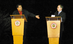據(jù)外電報道,22日在墨西哥召開的拉美峰會上,委內(nèi)瑞拉總統(tǒng)查韋斯與哥倫比亞總統(tǒng)烏里韋互相指責(zé),甚至口出侮辱性詞語。查韋斯后來拂袖而去,而烏里韋不依不饒,諷刺查韋斯應(yīng)該“像個男人一樣承擔(dān)爭吵的后果”。