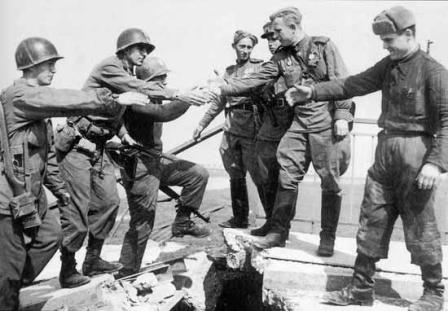 1945年4月25日,一支美軍偵察隊(duì)與一隊(duì)蘇軍在德國城市托爾高(Torgau)南部易北河畔的一座橋上勝利會師,一幅美蘇兩軍士兵握手的照片從此傳遍世界,成為反法西斯戰(zhàn)爭歐洲戰(zhàn)場出現(xiàn)勝利曙光,希特勒政權(quán)即將滅亡的最廣為人知的象征之一。