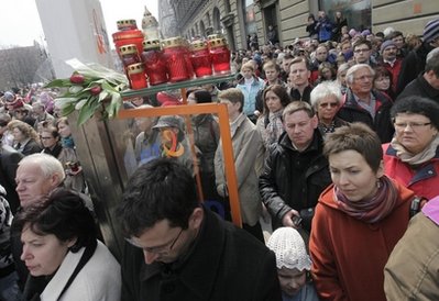 華沙廣場上聚集著越來越多前來悼念的人群,年長的婦女手中緊握神像,年輕的夫婦手捧著郁金香,稚氣未消的孩童帶來了自己畫的蠟筆畫和心愛的玩具,他們都將自己的紀念品放在了裝點著蠟燭的臨時紀念場所。
