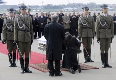 卡欽斯基的靈柩11日由一架波軍直升機(jī)從撞機(jī)地點(diǎn)俄羅斯斯摩棱斯克運(yùn)返波蘭首都華沙,代理總統(tǒng)科莫羅夫斯基、總理圖斯克等官員在場迎接,以一場簡短的宗教儀式向其致祭。靈柩將會(huì)由軍隊(duì)護(hù)送到總統(tǒng)府,稍后,當(dāng)局將會(huì)把總統(tǒng)府開放,讓民眾進(jìn)入瞻仰卡欽斯基的遺容。