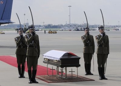 在機場至總統(tǒng)府的道路兩旁,民眾手持鮮花,默默佇立,目送總統(tǒng)靈柩經(jīng)過。其后卡欽斯基遺體被運往華沙總統(tǒng)府的禱告室內(nèi),將在那里擺放7天,以供親屬及民眾瞻仰。7天之后,波蘭將為這位在空難中不幸罹難的總統(tǒng)舉行葬禮。