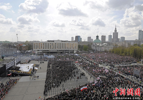 多達(dá)數(shù)十萬人聚集在波蘭首都華沙皮蘇特斯基廣場,為96名遇難者送上最后的祝福和思念之情,與他們“道別”。