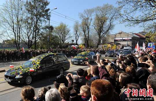 中新網(wǎng)4月18日電 綜合消息,當?shù)貢r間18日下午2點(北京時間晚上8點),在空難中不幸殞命的波蘭總統(tǒng)卡欽斯基夫婦的國葬儀式在波蘭南部城市克拉科夫舉行。數(shù)萬名群眾聚集在一起,向總統(tǒng)夫婦做最后的“道別”。