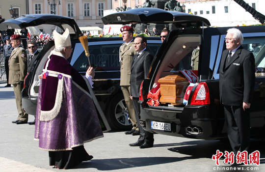 當天早些時候,卡欽斯基夫婦的遺體由軍方飛機從首都華沙運至克拉科夫,葬禮結束后,夫婦二人的遺體將被運往當?shù)赜兄锨隁v史的瓦維爾宮安葬。