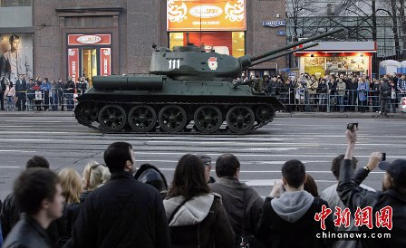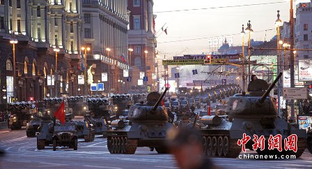據(jù)報(bào)道,27日,俄羅斯出動(dòng)約159輛軍用車輛及1萬(wàn)多名軍人,進(jìn)行了關(guān)于今年5月9日俄羅斯衛(wèi)國(guó)戰(zhàn)爭(zhēng)“勝利日”65周年時(shí),紅場(chǎng)閱兵儀式的彩排活動(dòng)。此次閱兵分為兩部分:歷史部分和現(xiàn)代部分。歷史部分由身穿衛(wèi)國(guó)戰(zhàn)爭(zhēng)時(shí)期軍服的士兵游行,同時(shí)還會(huì)有9輛T-34坦克和8輛SU-100自行火炮進(jìn)行在游行隊(duì)伍當(dāng)中,F(xiàn)代部分則由13輛老虎裝甲車、BTR-80裝甲車、BMP-3步兵戰(zhàn)車、T-90A坦克和S-400防空系統(tǒng)等組成。