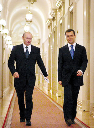 普京在自己的第二任總統(tǒng)任期結(jié)束時欽點梅德韋杰夫作接班人。作為俄羅斯最受歡迎的政治家,普京可望在2012年再度競選總統(tǒng),且如果成功,他可以一直執(zhí)政至2024年。