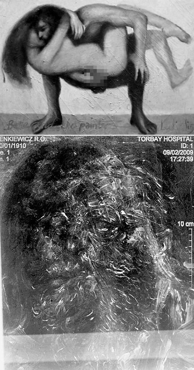 中新網(wǎng)6月23日電 據(jù)香港《文匯報(bào)》23日援引外電報(bào)道,英國(guó)一名藝術(shù)品收藏家于2003年以8500英鎊買入一幅已故畫家羅伯特-林克維科茨與女模特兒赤裸的自畫像(上圖)。該名收藏家聽取專家意見,把畫拿去醫(yī)院進(jìn)行X光掃描,竟發(fā)現(xiàn)畫中有畫,油畫之下蓋另一幅流浪漢肖像畫(下圖),之前從未被拍賣過,估計(jì)價(jià)值逾5萬英鎊。收藏家相信羅伯特-林克維科茨用畫蓋另一幅畫是另有目的。