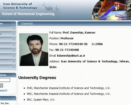 根據(jù)戴尼斯鳩的官方自傳,他曾在英國(guó)“倫敦學(xué)院”獲得航空和航天工程博士學(xué)位。問(wèn)題是,英國(guó)根本就沒(méi)有這樣一所大學(xué)。Mowjcamp推測(cè)說(shuō),戴尼斯鳩的意思可能是指英國(guó)“帝國(guó)理工大學(xué)”,那所學(xué)校確實(shí)有航空學(xué)院。但戴尼斯鳩在德黑蘭工業(yè)科技大學(xué)網(wǎng)站上的簡(jiǎn)歷卻與此不同,網(wǎng)上說(shuō),他在瑪莉皇后學(xué)院(倫敦大學(xué)的最大學(xué)院之一)獲得學(xué)士學(xué)位。