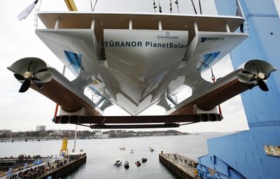 這艘名為“星球太陽能號”(PlanetSolar)的船是一艘雙體船,長度達31米,寬度15米,高約7.5米,看上去就像是一艘有著藍色和白色外殼的宇宙飛船。