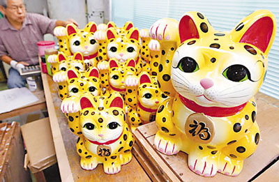 因日語中“豹”和“票”發(fā)音相同,原本“招財貓”的身體被圖上了豹子花紋。“招票貓”每只都由手工涂上黃色和黑色的顏料。據(jù)說制作這樣的一只至少需要4天,而上色一天只能完成20只。