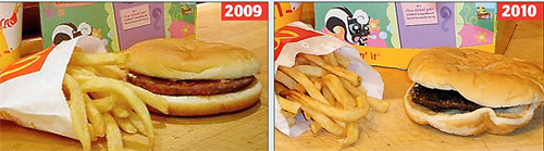 中新網(wǎng)3月20日電 同一份麥當(dāng)勞“開(kāi)心樂(lè)園餐”,相隔12個(gè)月拍下的兩張照片,看起來(lái)竟然幾乎一模一樣。據(jù)香港《文匯報(bào)》報(bào)道,一般來(lái)說(shuō),放了一年的食物應(yīng)該發(fā)霉或分解成一堆廢料,但麥當(dāng)勞兒童餐卻幾乎沒(méi)有腐壞,只是漢堡牛扒萎縮和不新鮮的漢堡面包干裂。