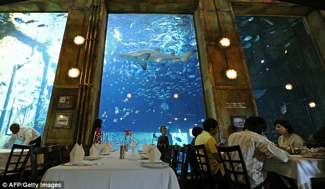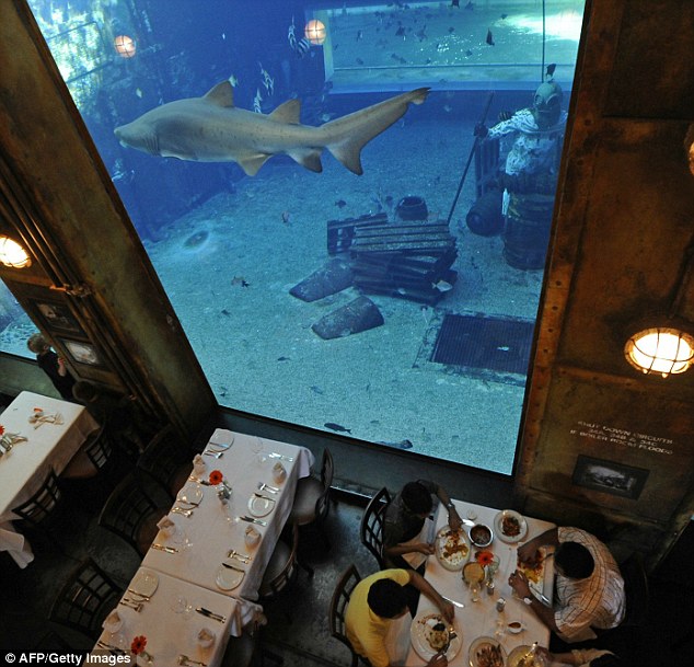 當(dāng)你在船尾這家涼爽昏暗的角落,大嚼著生猛海鮮,這家海洋樂園著名的鯊魚,會(huì)從你就餐的窗戶外遨游而過。