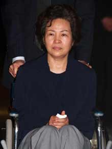 在25日盧武鉉入殮儀式之前,權(quán)良淑女士眼中滿含淚水,從慶尚南道金海市峰下村坐輪椅前往了靈堂。