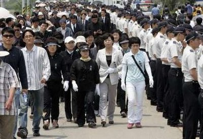 中新網(wǎng)5月26日電 韓國慶尚南道金海市峰下村25日的白天最高氣溫達(dá)到了30度,當(dāng)天是韓國前總統(tǒng)盧武鉉逝世的第三天。從村子入口通往盧武鉉靈堂的兩公里長雙向2車道公路上,沒有一點(diǎn)兒背陰處。由于警方在村口阻止車輛進(jìn)入,市民們只能頭頂報(bào)紙、手帕、草帽,在往返需要一小時(shí)的炎熱的柏油路上步行前往焚香所。很多人即使汗如雨下也沒有脫掉黑色的西服上衣。