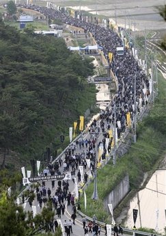 從24日上午至27日下午4時,在四天時間里共有38萬多名吊客在這里就餐。主要由附近村莊的婦女會員和義勇消防隊隊員組成的300多人的志愿團從上午11時到晚10時準備出供10萬多人食用的飯(以27日為準),分發(fā)給市民。晚10時以后提供面包和牛奶、碗面。據(jù)悉,在29日舉行盧武鉉遺體告別儀式后,葬禮委員會和金海市政府等將分擔(dān)食品費用。