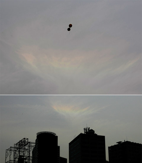 中新網(wǎng)6月2日電 據(jù)韓國(guó)《中央日?qǐng)?bào)》報(bào)道,韓國(guó)前總統(tǒng)盧武鉉方面1日向外界發(fā)布了德壽宮上空出現(xiàn)彩虹的照片,這些照片攝于上個(gè)月29日在首爾廣場(chǎng)為盧武鉉進(jìn)行路祭的時(shí)候。