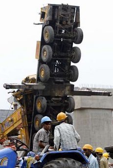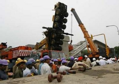 此前一天,該處地鐵施工工地發(fā)生高架橋坍塌事故,造成6人死亡、15人受傷。一天后,在該事故清理現(xiàn)場(chǎng)又發(fā)生了起重機(jī)倒塌事故,造成4人受傷。