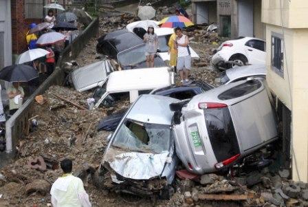 該國(guó)第二大城市釜山在強(qiáng)降雨后發(fā)生泥石流。