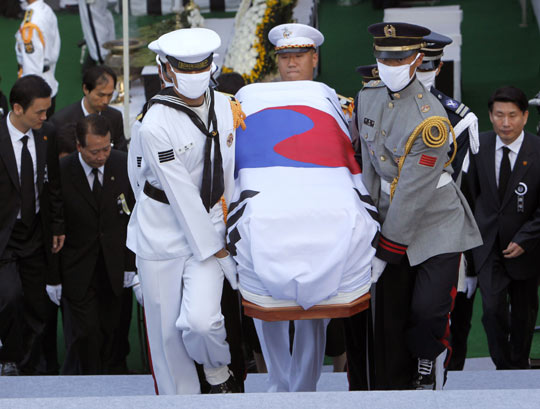 金大中遺屬李姬鎬女士等、韓國總統(tǒng)李明博和第一夫人金潤玉、前總統(tǒng)金泳三、憲法機關(guān)負責人、駐韓外交使節(jié)、各國代表及市民等歷史最大規(guī)模的3萬多人參加了當天在國會前院舉行的遺體告別儀式。儀式持續(xù)約90分鐘。