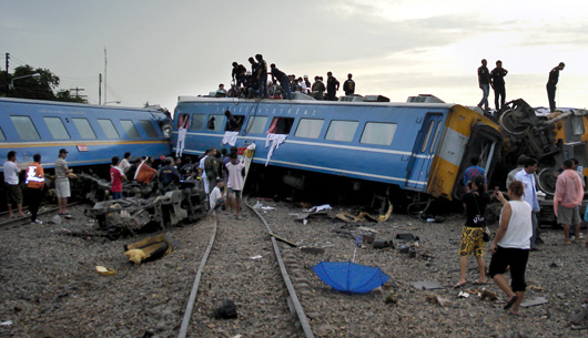 據(jù)此間泰國(guó)民族網(wǎng)站報(bào)道,事故今天早上四點(diǎn)四十五分發(fā)生在華欣縣的號(hào)陶站,事故發(fā)生時(shí),這輛有十六節(jié)車廂的火車至少有六個(gè)車廂出軌,并當(dāng)場(chǎng)造成七名女旅客死亡,逾百名旅客受傷。