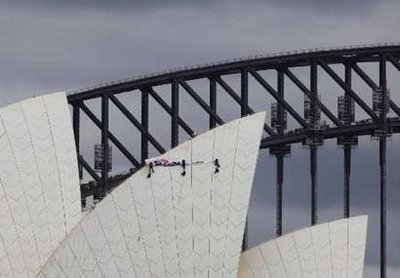 據(jù)報道,在哥本哈根召開的氣候峰會上,發(fā)達(dá)國家和發(fā)展中國家兩大陣營之間仍在僵持,各界對峰會結(jié)果的悲觀情緒彌漫會場。15日,5名綠色和平組織成員抓著繩索爬上了悉尼歌劇院,并拉開一個100平米大的條幅,上面寫著“不要再玩政治——立刻達(dá)成氣候協(xié)議”。事后,這5人被警方逮捕。