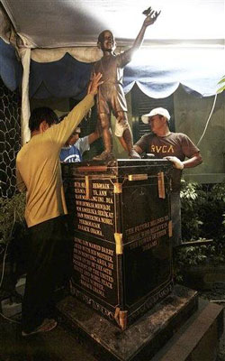 報道稱,銅像此前安放在雅加達的一座公園,但由于遭到公眾的反對才被重新安置在他曾經(jīng)就讀過的學校,校方的領導和當?shù)氐慕逃賳T為這座銅像舉行了簡短而又低調(diào)的揭幕儀式。