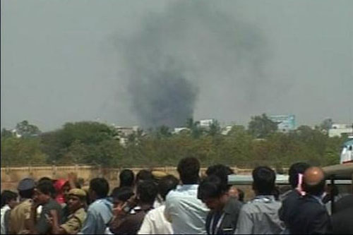 在印度海得拉巴3日開幕的航展上,這架海軍飛機起飛不久就墜入航展現(xiàn)場旁邊一個人口稠密的居民區(qū)。一棟3層高的樓房受損嚴重,周圍其它建筑也遭到不同程度損傷。