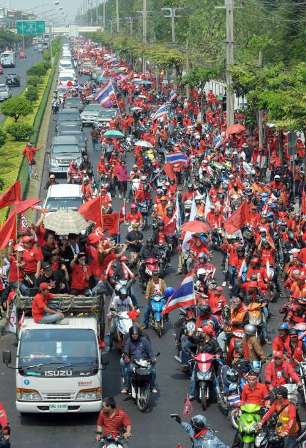 第一波示威活動(dòng)于12日傍晚結(jié)束。紅衫軍13日將重新集結(jié),前往皇家田廣場(chǎng)等主要集會(huì)場(chǎng)所,附近是熱門(mén)旅游景點(diǎn)大皇宮及玉佛寺。東北部和北部各省的上萬(wàn)紅衫軍支持者昨天也開(kāi)始向曼谷出發(fā),將于周日抵達(dá)。
