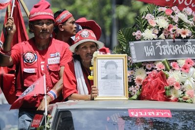 紅衫軍一名領(lǐng)導(dǎo)人稱,他們抬著11個(gè)棺材進(jìn)行游行,里面放著死于周六暴力沖突的喪生者遺體。泰國(guó)政府部門稱,當(dāng)天有4名軍人和17名平民死亡,政府周一將對(duì)9具尸體進(jìn)行尸檢。