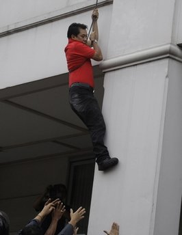 紅衫軍領(lǐng)導(dǎo)人阿里斯曼(Arisman Pongruanrong)通過繩梯從位于曼谷市中心的這家酒店爬下,在等候的紅衫軍民眾的幫助下,進(jìn)入一輛車中然后迅速離開。另外一名紅衫軍領(lǐng)導(dǎo)人從酒店窗戶爬出并順著一棵樹滑下,也成功逃離現(xiàn)場(chǎng)。