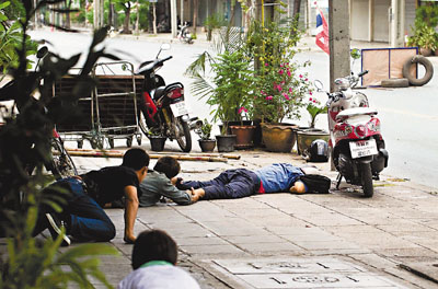 軍隊(duì)包圍“紅色戰(zhàn)區(qū)”,四周不時傳出槍聲和爆炸聲,軍方加強(qiáng)搜查武器和繼續(xù)“有出無入”的策略。政府發(fā)言人說,前晚主陣地的示威人數(shù)減至6000,證明封鎖策略有效,相信老人和小童已撤走。