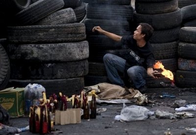 有“紅衫軍”成員將一輛油罐車駛至一個(gè)主要路口,并燃燒輪胎企圖引爆。目擊者說(shuō),除了商場(chǎng)和酒店林立的商業(yè)區(qū)外,市內(nèi)另一處地區(qū)也發(fā)生流血事件。有三幢商業(yè)大廈著火焚燒。當(dāng)局周一開始局部封鎖市內(nèi)著名游客區(qū)蘇坤蔚路。