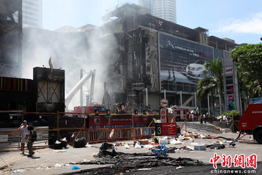 離此咫尺之遙的便是曾被曼谷人引以為豪、號稱亞洲第二大的森特沃購物中心,19日下午被人放火燃燒。記者在現(xiàn)場看到,該樓的部分建筑已經(jīng)垮塌,三支高壓水龍正對著垮塌處噴水。據(jù)稱,當(dāng)天搜救人員從廢墟中發(fā)現(xiàn)一年齡大約35歲男子的尸體。官方初步估計,曼谷19日晚至20日晨火災(zāi)造成的損失或達數(shù)十億美元。