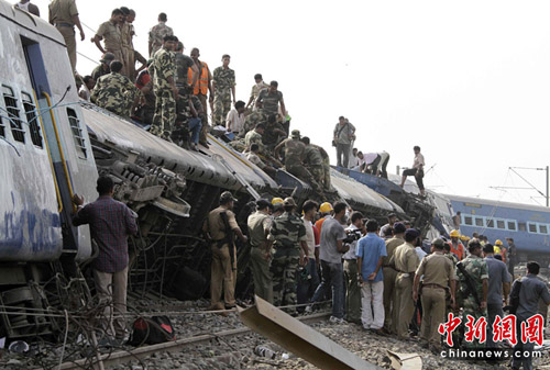 中新網(wǎng)5月28日電 綜合報(bào)道 當(dāng)?shù)貢r(shí)間28日凌晨1時(shí)30分,在印度東部西孟加拉邦西米德納布爾附近,一輛高速行駛的旅客列車遭襲致13節(jié)車廂脫軌,其中3節(jié)車廂又與對(duì)面駛來的貨運(yùn)列車相撞。目前為止,事故至少造成65人死亡,200多人受傷。