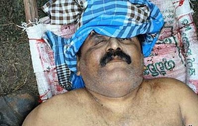 斯里蘭卡國家電視臺(tái)播放的錄像畫面顯示,一個(gè)看上去很像是泰米爾猛虎反叛組織領(lǐng)袖的尸體,身穿迷彩服,頭的頂部蓋著一塊布,顯然是遮掩一個(gè)傷口。