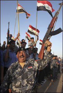 中新網(wǎng)6月30日電 據(jù)英國廣播公司報道,29日,伊拉克政府軍士兵比預(yù)定交接時間提前一天開始慶祝美國軍隊正式撤出巴格達(dá)。