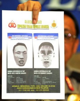 這兩張畫像是以在爆炸現(xiàn)場發(fā)現(xiàn)的兩顆遭嚴(yán)重?fù)p毀的頭顱為依據(jù)制作出來的。印尼警方發(fā)言人稱,“我們在爆炸地點(diǎn)發(fā)現(xiàn)了兩顆遭嚴(yán)重?fù)p毀的頭顱,而且我們肯定他們就是自殺式人彈的嫌疑人!