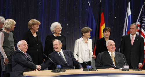 紀(jì)念活動主辦方贊揚(yáng)老布什與戈爾巴喬夫分任美蘇領(lǐng)袖時,對拆除柏林墻及促成兩德統(tǒng)一的貢獻(xiàn),還贊揚(yáng)德國前總理科爾“抓住關(guān)鍵的一刻”,促成德國統(tǒng)一。