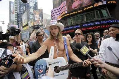 中新網(wǎng)7月23日電 美國紐約知名度頗高的街頭藝人“裸體牛仔”宣布要競(jìng)選紐約市長,他承諾要把他的穿著風(fēng)格、也就是不穿,落實(shí)在施政上,讓政治更透明。