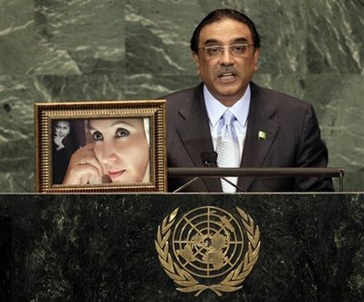 中新網(wǎng)9月27日電 巴基斯坦總統(tǒng)扎爾達(dá)里在聯(lián)合國大會上演講時(shí),把他的已故夫人貝-布托和岳父布托的照片擺上演講臺,并吁請世界各國為巴國打擊恐怖主義和宗教極端主義提供更多協(xié)助。