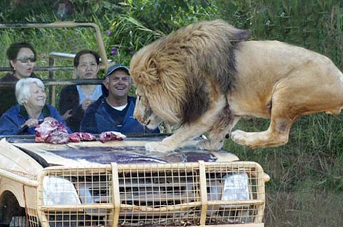 園方巧妙設(shè)置的吉普車(chē),強(qiáng)化玻璃恰好就在擋風(fēng)玻璃處隔開(kāi)籠內(nèi)與籠外,工作人員還在引擎蓋上放生肉吸引獅子跳上來(lái),也讓游客能近距離觀賞。獅子大塊咬肉的模樣真夠嚇人,不少游客坐在車(chē)中都覺(jué)得自己彷佛就要成為猛獅的點(diǎn)心了。