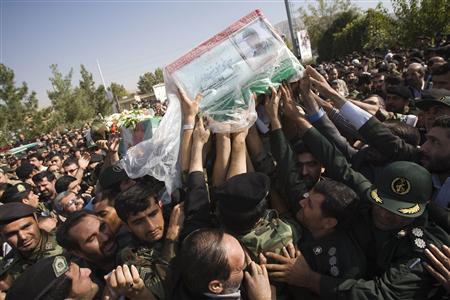 幾千名伊朗人,大部分為軍人,參加了在德黑蘭革命衛(wèi)隊(duì)基地舉行的葬禮,人群高舉遇難將領(lǐng)與最高精神領(lǐng)袖哈梅內(nèi)伊的巨幅照片。