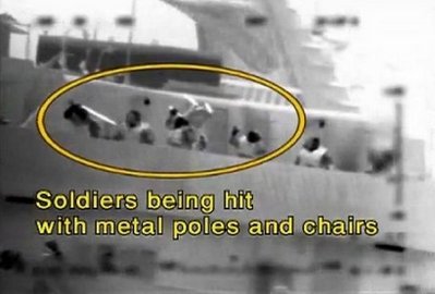 以軍發(fā)布長1分鐘的紅外線錄影片段,并配上英文字幕上載至YouTube網(wǎng)站。片段可見,當(dāng)首名士兵從直升機游繩而下,甫踏足土耳其救援船“馬維.馬爾馬拉號”甲板之際,一名船員便向他投擲閃光彈,甲板上的人紛找掩護或伏在地上。這時候,有船員抓住以軍的繩子搖晃,一名士兵似脫手掉下。他們又把繩子縛在甲板,企圖扯下直升機。降落甲板計程車兵遭佩戴防毒面具的船員攻擊。字幕稱:“士兵遭人以金屬棒和椅子毆打。”船員又企圖搶奪士兵的武器,一名士兵更被多名船員合力抓住雙腿,從甲板拋下。