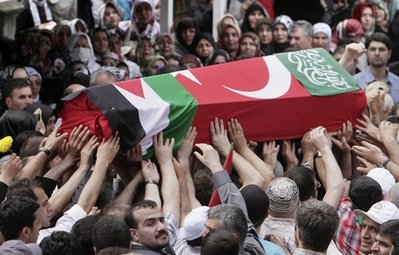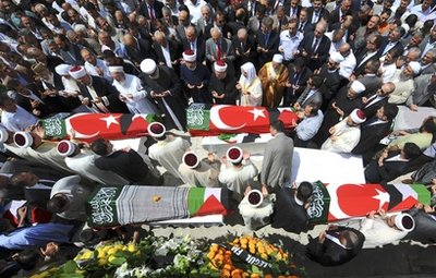 周四(3日),九名死者的尸體被從以色列運(yùn)回土耳其。450多名活動(dòng)人士也一同抵達(dá),他們受到英雄般的歡迎。九名死者都是土耳其人或出生在土耳其,他們的棺材上覆蓋著土耳其和巴勒斯坦的國(guó)旗。