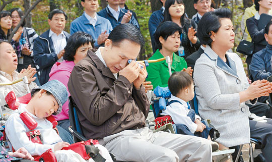 當(dāng)聽到連發(fā)音都不甚標(biāo)準(zhǔn)的殘疾人兒童認(rèn)真的歌唱,金潤玉女士馬上流下了眼淚,李明博總統(tǒng)最后也忍不住落下了淚水。