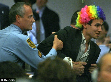 據(jù)美聯(lián)社報道,當伊朗總統(tǒng)內(nèi)賈德20日在瑞士日內(nèi)瓦聯(lián)合國反種族主義大會發(fā)表批評以色列的言論時,數(shù)十位西方外交官中途退場,兩名化裝成小丑的示威者向內(nèi)賈德投擲假鼻子。會議從一開始就很混亂。當內(nèi)賈德開始講演時,兩名戴著彩色假發(fā)的示威者向他扔去了小丑的紅色假鼻子。來自法國的一個猶太學生組織稱,它試圖向人們傳達“會議只不過是一場假面舞會”的信息。一名示威者大喊:“你是一個種族主義者!!彼土硪幻就唠S后被安保人員帶離現(xiàn)場。內(nèi)賈德回應稱:“我請所有尊敬的貴賓原諒這些無知的人。他們沒有得到足夠的信息。”