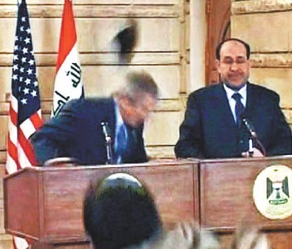 于伊拉克開記者會期間,遭伊拉克記者扎赫迪的“鞋彈”襲擊,難得的是他閃躲得快,有人更戲稱他的身手好比電影《22世紀(jì)殺人網(wǎng)絡(luò)》中的基諾里維斯。