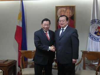 劉大使表示,加強(qiáng)中菲友好合作符合兩國(guó)利益,有利于本地區(qū)和平與發(fā)展。他提議:兩國(guó)應(yīng)進(jìn)一步加強(qiáng)相互了解,增進(jìn)政治互信;加強(qiáng)經(jīng)貿(mào)往來(lái),中方愿積極參與菲民生和基礎(chǔ)設(shè)施等項(xiàng)目;加強(qiáng)在地區(qū)和國(guó)際事務(wù)中的合作,共同應(yīng)對(duì)國(guó)際金融危機(jī);加強(qiáng)文教、旅游合作及民間交往。劉大使介紹了當(dāng)前兩岸和平發(fā)展的新形勢(shì),望菲方繼續(xù)堅(jiān)持一個(gè)中國(guó)政策。羅慕洛外長(zhǎng)贊同劉大使所談并表示,菲方高度重視對(duì)華關(guān)系,阿羅約總統(tǒng)去年就3度訪華。世界、東盟、菲律賓得益于中國(guó)的快速發(fā)展。他表示,臺(tái)灣問(wèn)題是中國(guó)內(nèi)政,菲方將繼續(xù)堅(jiān)定奉行一個(gè)中國(guó)政策。